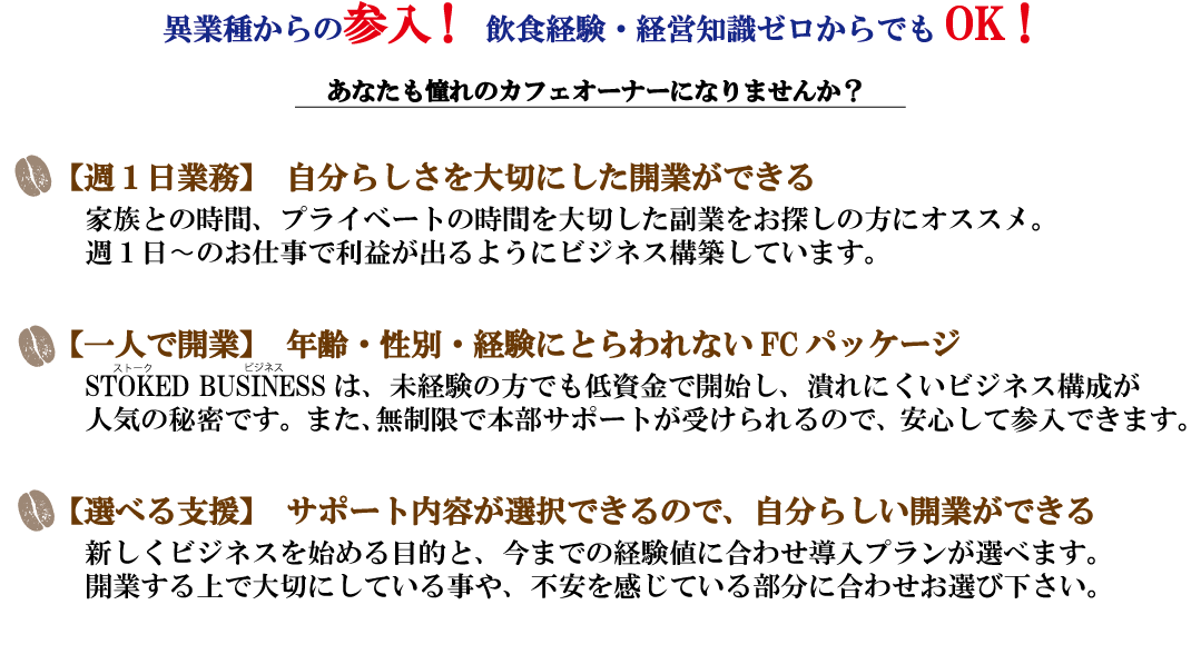 「贅沢に時間を使い、こだわり抜いた一杯のコーヒーを淹れる。」こんなカッコいい生き方を仕事にしませんか?憧れはあるものの開業・経営に対して不安がある方。開業したいけれど、開業予算がない方に、ご自身のペースで少しずつ、かつ、確実に一歩を踏み出せるサポートがあるのもSTOKED BUSINES(ストーク ビジネス)が人気の理由です。