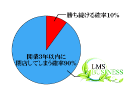 しかし、競争の激しい既存市場により閉店する店舗も目立ちます。実数として、開店後3年以内に閉店する確立(市場)90%とも言われています。つまり、閉店せず勝ち続ける店舗(市場)は10%しかないという事です。美容サロン業界で開業後の成功率が低い要因は下記5点です。
